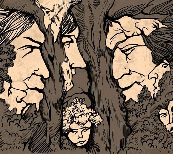 La première fois que j’ai vu cette illustration, j’ai cru qu’il s’agissait d’un simple paysage : quelques arbres, un fond clair, rien de particulier. Et puis, au bout de quelques secondes, un détail a tout changé. Une courbe de branche a dessiné un front, une zone d’ombre a pris la forme d’un œil, puis d’un deuxième… et soudain, impossible d’ignorer ces visages dissimulés. Comme si la forêt elle-même s’était mise à me regarder.