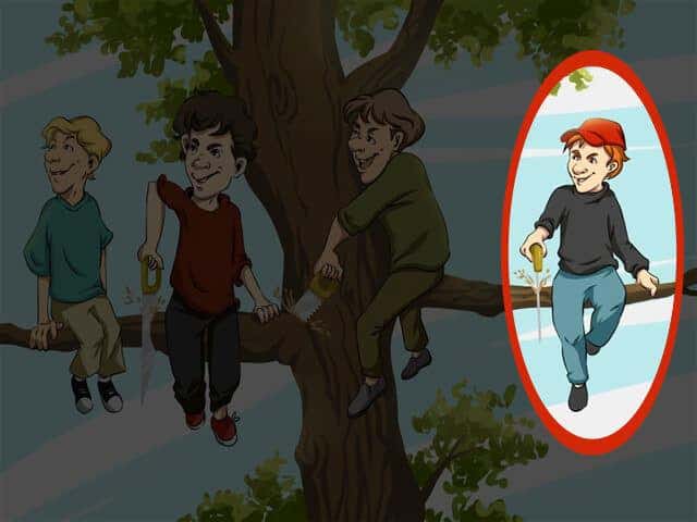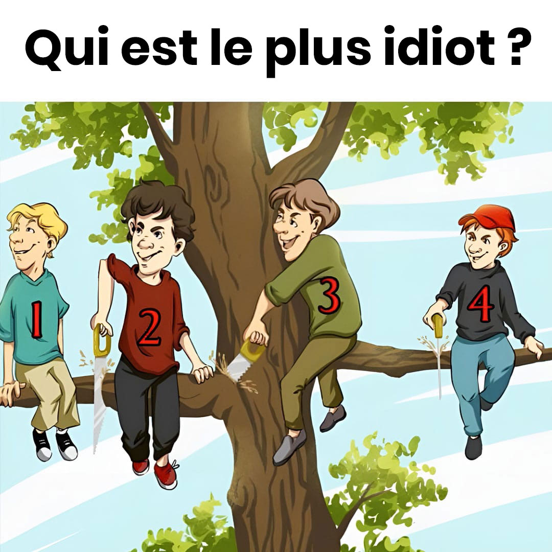 Si vous avez identifié le garçon arborant un couvre-chef rouge (numéro 4) comme celui qui commet la plus lourde faute, félicitations ! C’est bel et bien lui qui accomplit l’impair le plus visible. Il scie directement la section de l’arbre qui lui sert de siège, ce qui le voue inévitablement à une dégringolade.