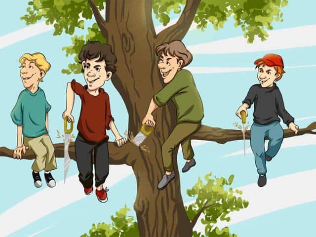 Au premier coup d’œil, la solution paraît élémentaire : celui qui entame le morceau de bois qui le supporte, évidemment ! Notre esprit conclut instantanément qu’il va choir, faisant de lui le parfait prétendant au titre de « plus grande bévue ».