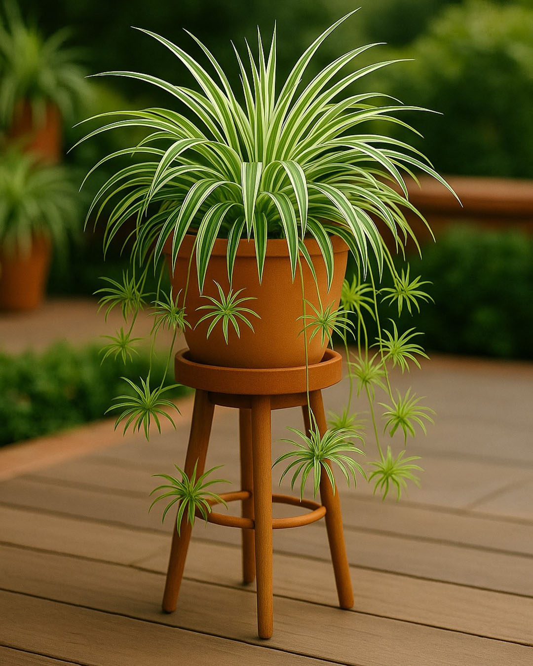 Gros plan sur un chlorophytum en pot, montrant sa rosette de feuilles et ses stolons