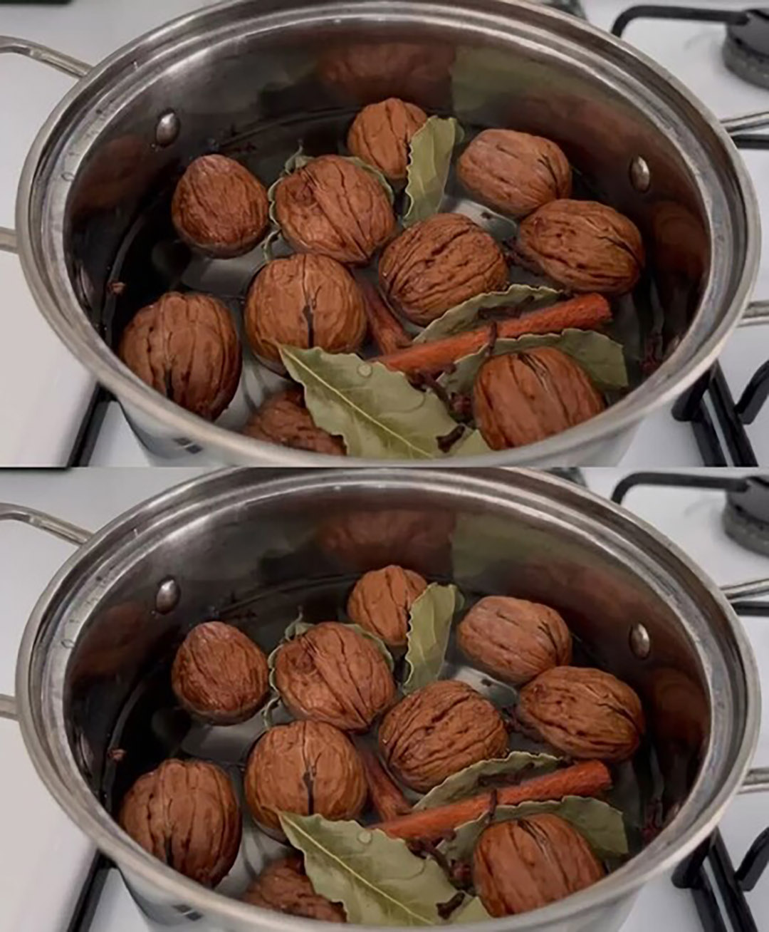 Commencez par placer dans une casserole les noix, les feuilles de laurier, la cannelle et les clous de girofle. Recouvrez le tout avec l’eau et portez à ébullition. Une fois les premiers bouillons apparus, couvrez et laissez frémir doucement pendant une dizaine de minutes. Retirez du feu et laissez refroidir complètement, toujours à couvert, pour permettre aux principes actifs et aux parfums de bien infuser. Une fois tiède, filtrez soigneusement le liquide dans un bocal en verre propre. Ajoutez alors l’huile d’olive et le vinaigre de cidre, et mélangez énergiquement jusqu’à obtenir une lotion bien homogène.